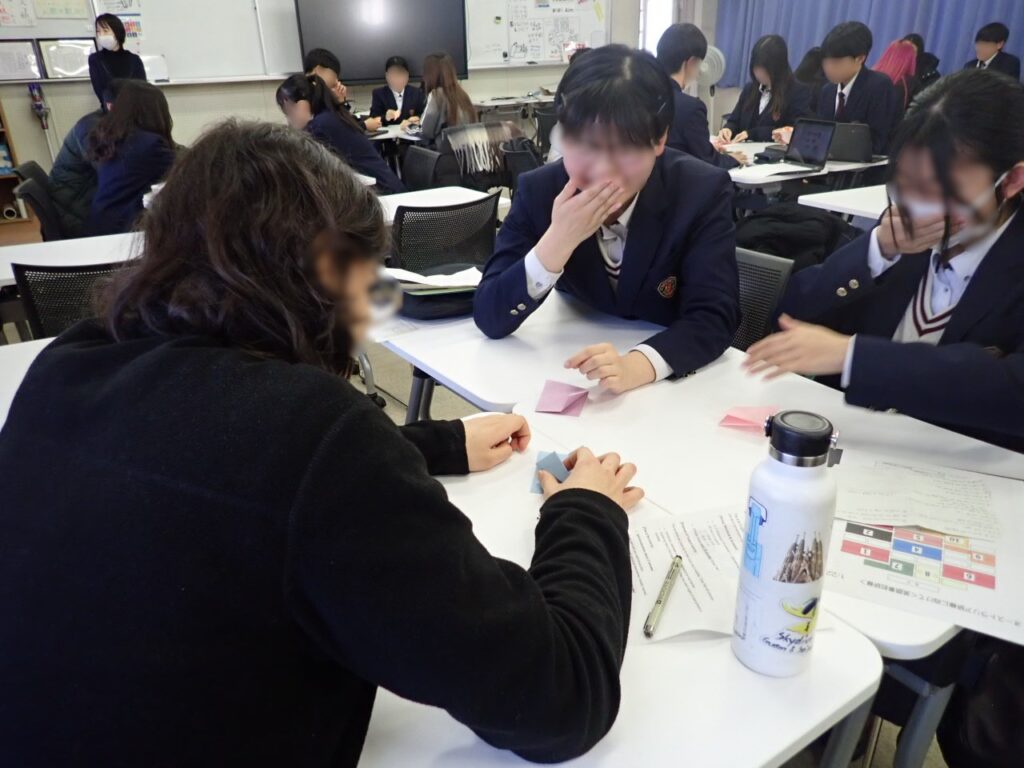 当日は、自己紹介や日本文化の紹介など事前に準備してきた成果を発揮し、2回目ということもあって自信をもって英語でのコミュニケーションに取り組んでいました。また、折り紙の折り方を英語でレクチャーしながら一緒に折る時間では、身振りも交えながら楽しそうにコミュニケーションを取っている姿が多く見られました。