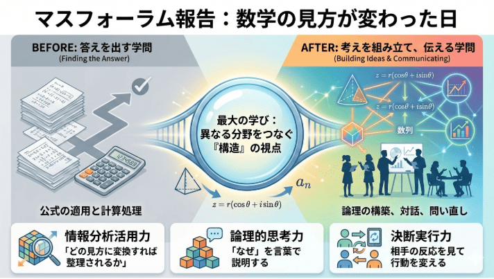 また、異なる分野をつなぐ発想や、「なぜその方法を選ぶのか」を説明することの重要性を学び、論理的思考力の本質に触れる経験となりました。