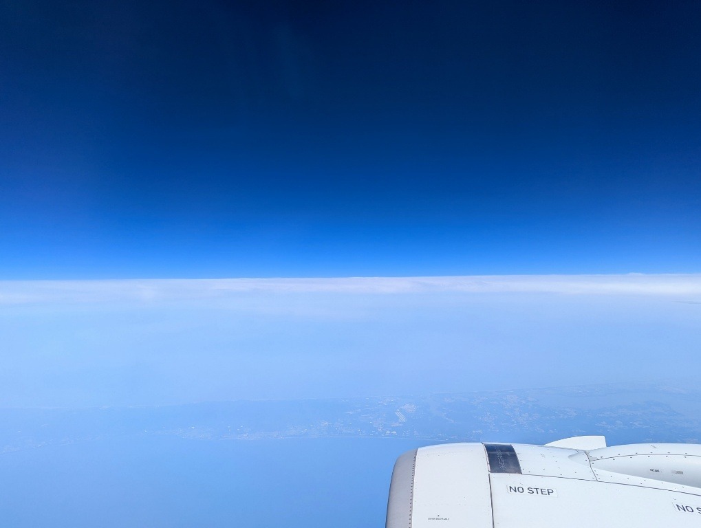 現地の天候は晴れ。飛行機内で知らされた外気温は26度。日光もあって生徒は「暑い!」と連呼しています。いまは果てなく真っすぐな高速道路を有珠山に向けて移動中です。