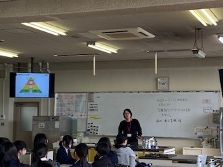 2月2日(月)の午後、家庭クラブ主催業として「受験生のための栄養講座」を開催しました。前半は簡単な朝食作りをしました。メニューは「チーズin焼きおにぎり」と「しょうが入りポカポカ豚汁」を調理実習をしました。後半は株式会社明治の食育セミナー担当の方が来校され、「受験飯でパフォーマンスの土台を作ろう!」という講義を受けました。朝食の大切さとともに、受験までの体づくりや睡眠の重要性を学びました。