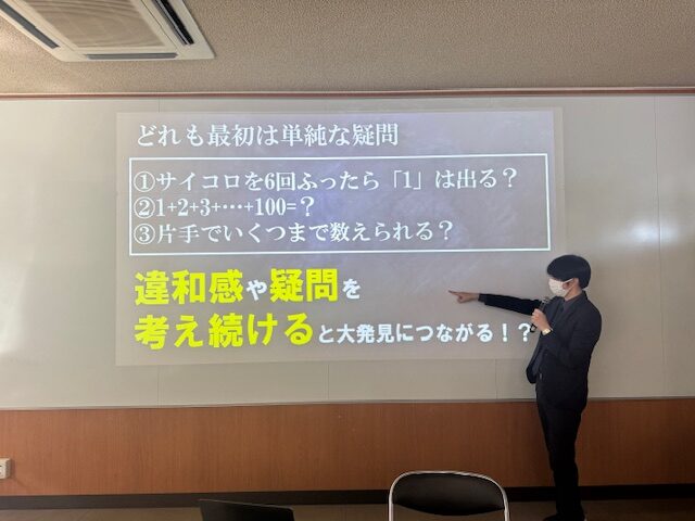 授業の冒頭では、サイコロや数列、指で数える方法など、身近な疑問を紹介しました。