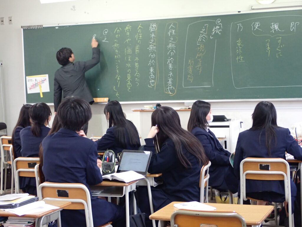 11月5日、2年生の古典探究・文系漢文の授業では、『孟子』の代表的な一節「性善」を題材に学びを深めました。この単元では、漢文の文法理解に加えて、「人間とはなにか」「善悪とはどこから生まれるのか」という哲学的な問いに向き合う「思考の探究」を行っています。