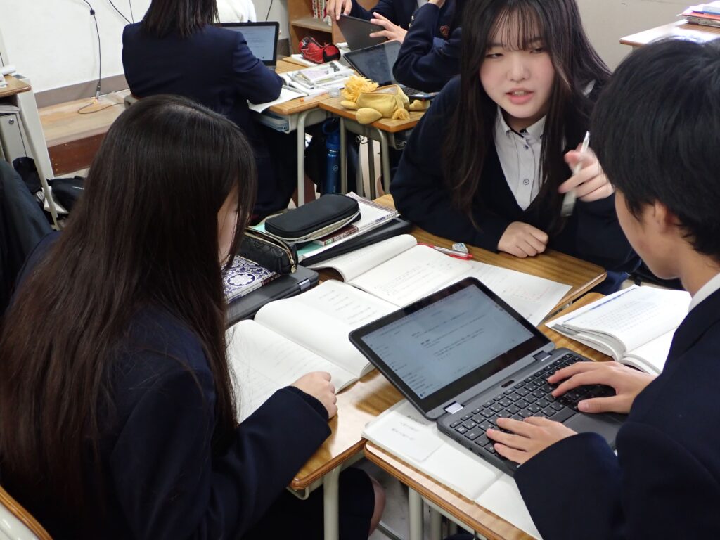 担当の元田先生は、「国語という教科は、言葉を通して人間を理解する教科。漢文法という知識をツールとして、漢文に現れている人々の考え方を知り、人間というものに対する自分の考えを深めてほしい。」と話します。探究の根幹にあるのは、習得した知識を使って思考した結果生まれる「問い」です。本校では、国語・数学・理科といった教科の枠を超えて、すべての学びを「探究」へとつなげていく授業づくりを進めてまいります。