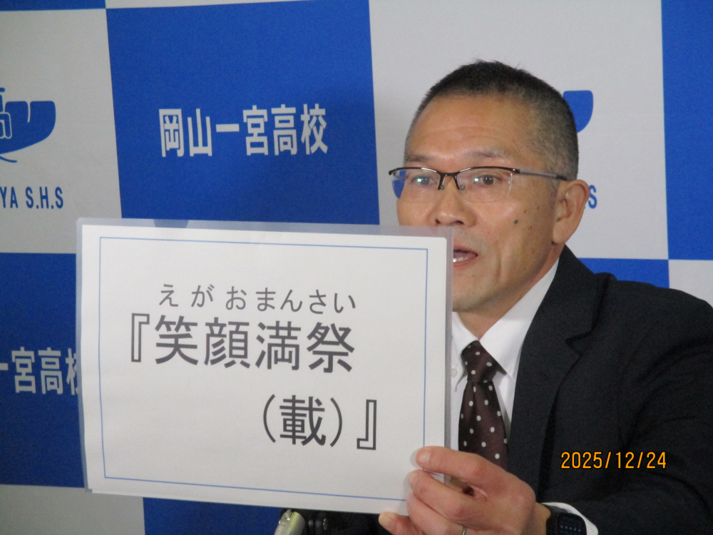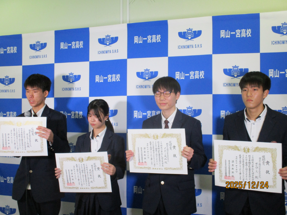 令和7年12月24日、2学期終業式が行われました。 校長式辞では、岡山一宮高校卒業生で2025年プロ野球ドラフト会議で阪神タイガースから指名を受けた岡城選手と、ノーベル化学賞を受賞された北川先生について取り上げられました。この二人の共通点は自分の立ち位置をみつめ、正直に精一杯前を向いて進んできた結果だとし、みなさんにもこのような決断実行力を身につけて欲しいという内容でした。 校歌斉唱の後、受賞披露式と壮行式、サイエンスレクチャーも行われました。