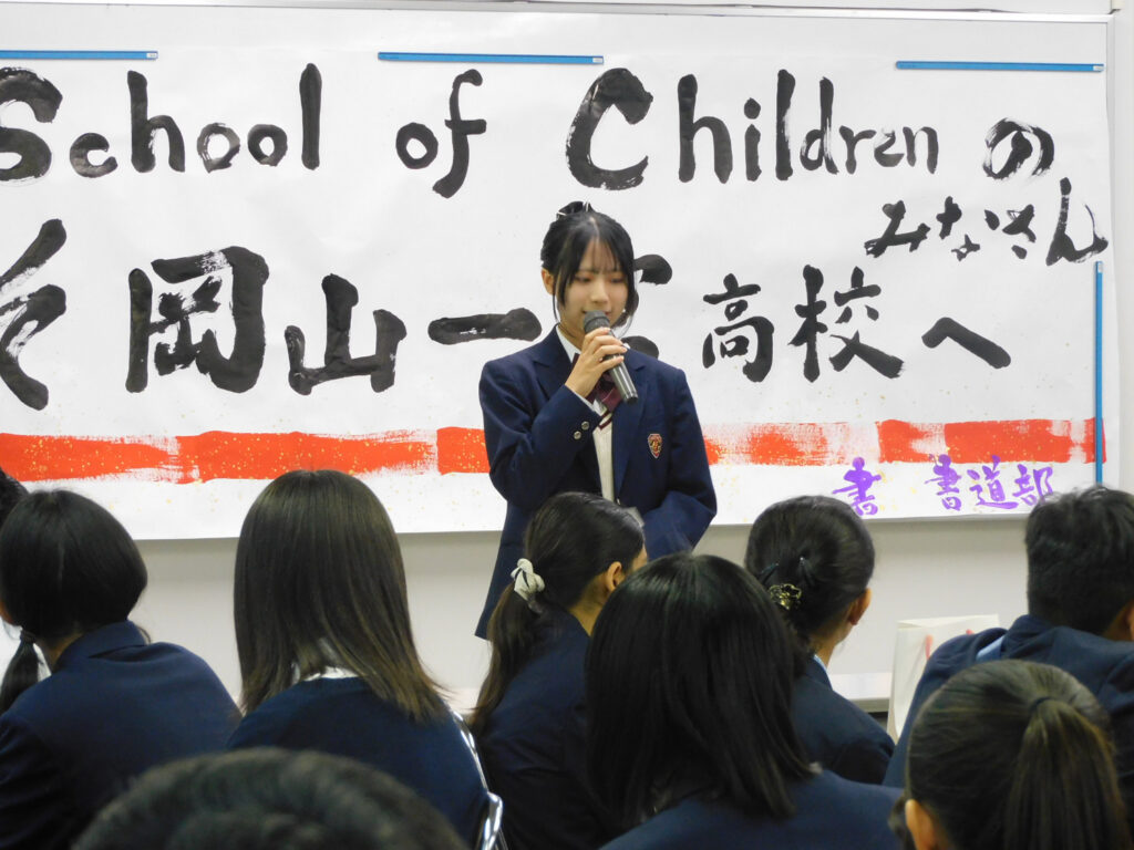 続いて行われた開会式では、両校の代表教員による挨拶と記念品の交換が行われました。本校からは、岡山県の特産品である張子の虎を贈呈しました。