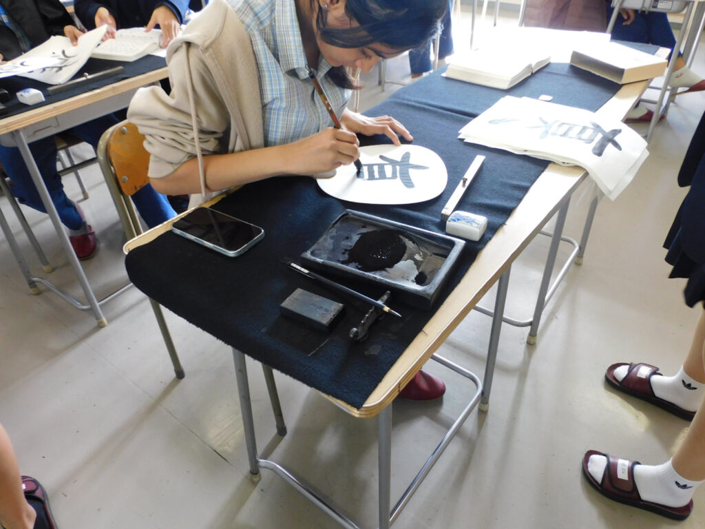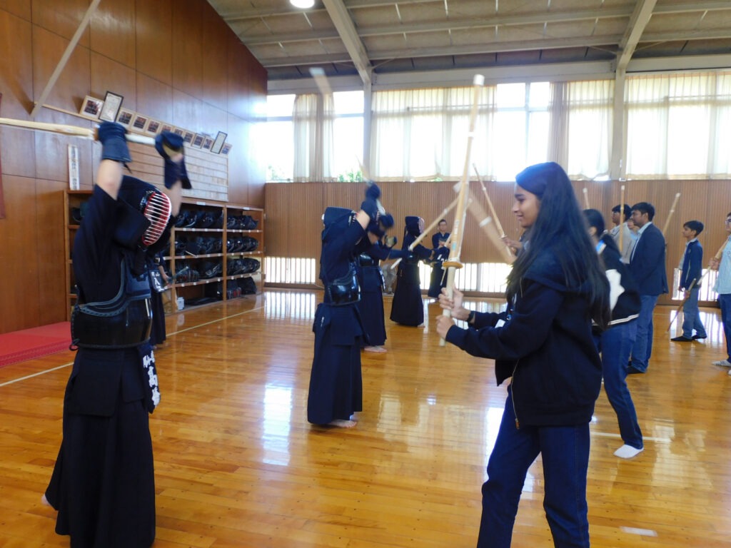 午前後半には、日本文化体験として「書道」と「剣道」に挑戦しました。バディの中には書道部や剣道部の部員や経験者もおり、インドの生徒たちをサポートしながら楽しく体験を進めました。