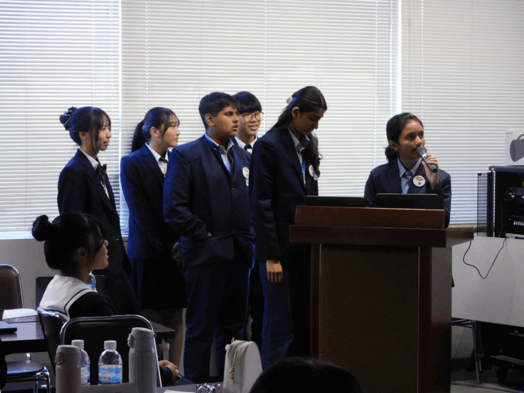 続いて行われたプレゼンテーション活動では、インドの高校生3名と日本人高校生3名で1チームとなり、チームで協力し、以下のテーマの中から一つを選んで英語で発表を行いました。